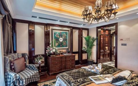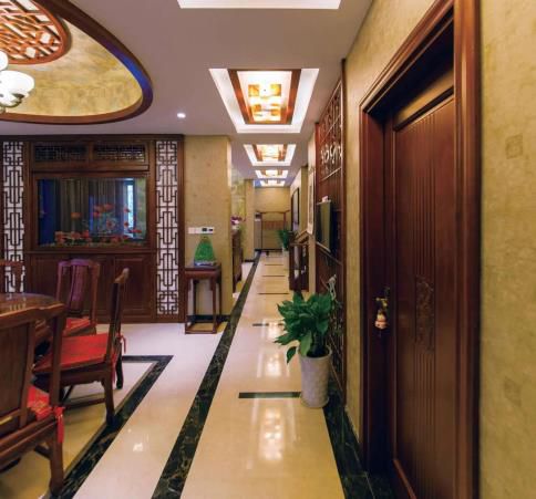 ▲蘋果木的實(shí)木門與墻面的實(shí)木外型一同彰顯出中式樣式的古樸高雅。