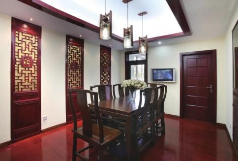 ▲棕赤色的實(shí)木門與空間的中式樣式完善匹配,統(tǒng)一了空間的總體色彩。