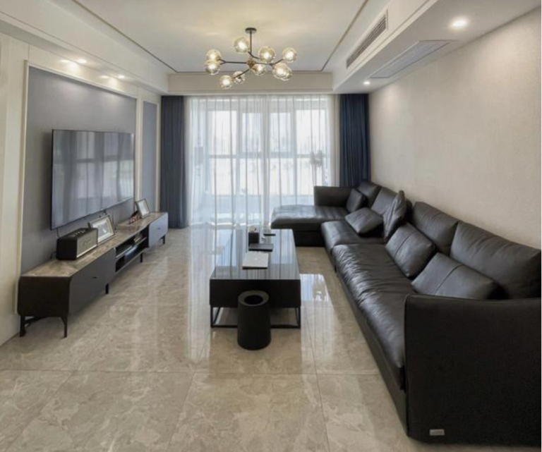 這是客廳,雖然還沒(méi)其他的軟裝裝飾,但是效果真心不錯(cuò)。客廳布置了“L”型真皮沙發(fā),黑色給人一種成熟穩(wěn)重的感覺(jué),不管是坐著還是躺著,都很舒服。安裝了吊頂,頂面貼了金屬線條,增加了視覺(jué)沖擊感,很是讓人喜歡,增加了時(shí)尚感。