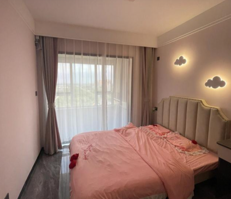 臥室空間不大,一張床加上床頭柜和衣柜基本沒(méi)有什么多余的空間了。床頭墻上安裝了網(wǎng)紅款的云朵壁燈,顏值非常高,可以起到很好的裝飾效果!頂面是沒(méi)有安裝吊頂,僅僅走了一圈石膏線條,看起來(lái)很有空間感。窗戶的位置設(shè)計(jì)了窗簾盒,顯得比較美觀,細(xì)節(jié)處理真心不錯(cuò)!