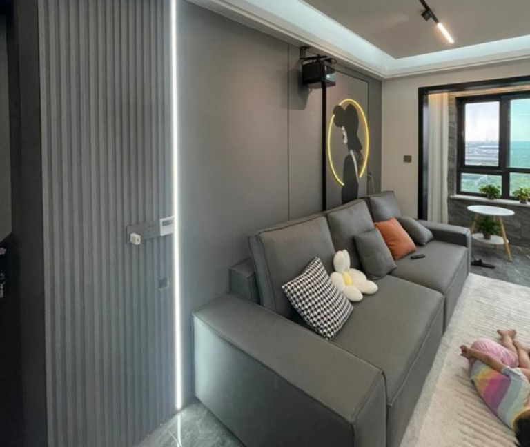 做了簡(jiǎn)單的電視背景墻,設(shè)計(jì)了格柵,效果還是蠻不錯(cuò)的。而且還加了線條燈裝飾,可以起到很好的氛圍效果,看著都很有檔次。而且還安裝了投影儀,以后可以方便使用。感受家庭影院的感覺(jué)!