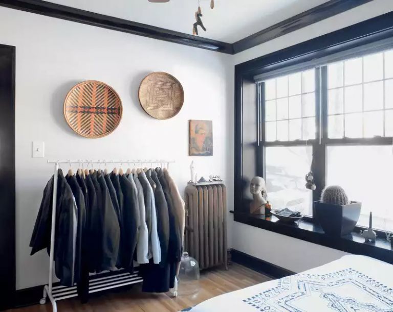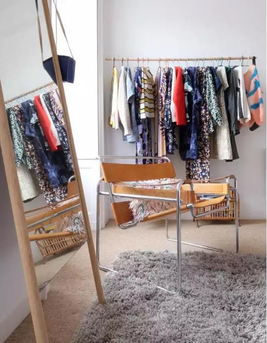 一個主臥室,主臥室太小,無法容納額外的衣柜。他們的解決方案是利用房間的一個小角落制作一個底部有木制鞋架的便攜式衣架。這個簡單的架子實際上是鋼管和木管的組合。