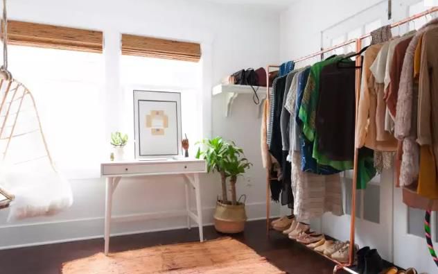 一間同樣沒有衣柜的房間。雖然她的儲物空間很大,但對于一個時尚博主來說還是不夠用。所以,女孩沒有買衣柜,而是把一間備用臥室變成了一個大衣柜。雖然不是每個人都有像海莉這樣的衣服專用的房間,但這對時尚達人來說也是一個有用的教訓:盡可能定制。